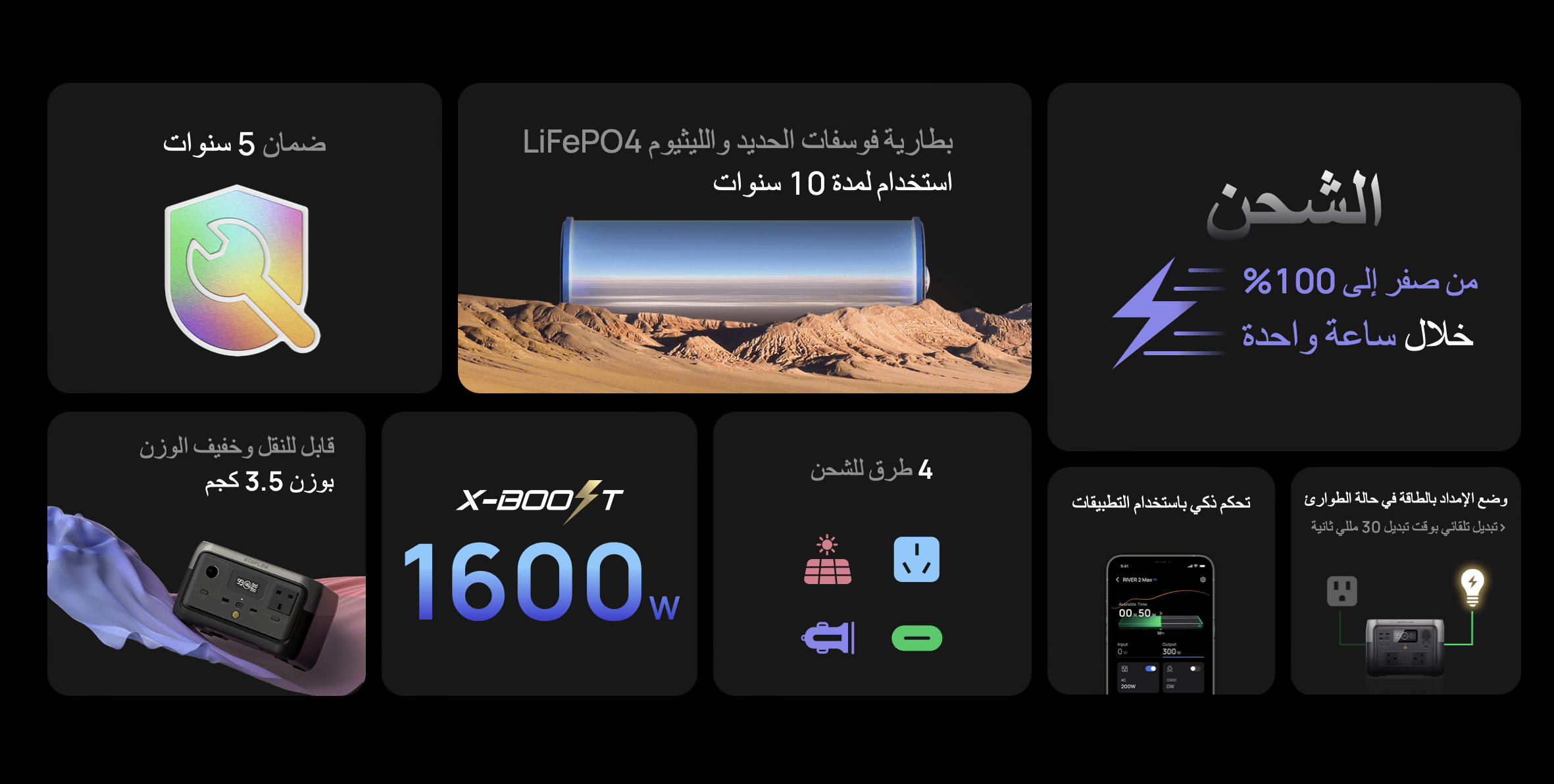 - توفر تكنولوجيا بطارية LiFePO4 المتطورة الطويلة الأمد استخدامًا آمنًا لمدة تصل إلى 10 سنوات. يمكن شحن وتفريغ سلسلة RIVER 2 أكثر من 3000 مرة، ما يعادل استخدامًا يوميًا لمدة 10 سنوات تقريبًا، وهو ضعفي متوسط الصناعة. بفضل خلايا LiFePO4، تعتبر سلسلة RIVER 2 آمنة وقوية وفعالة للغاية، حتى في درجات الحرارة العالية.